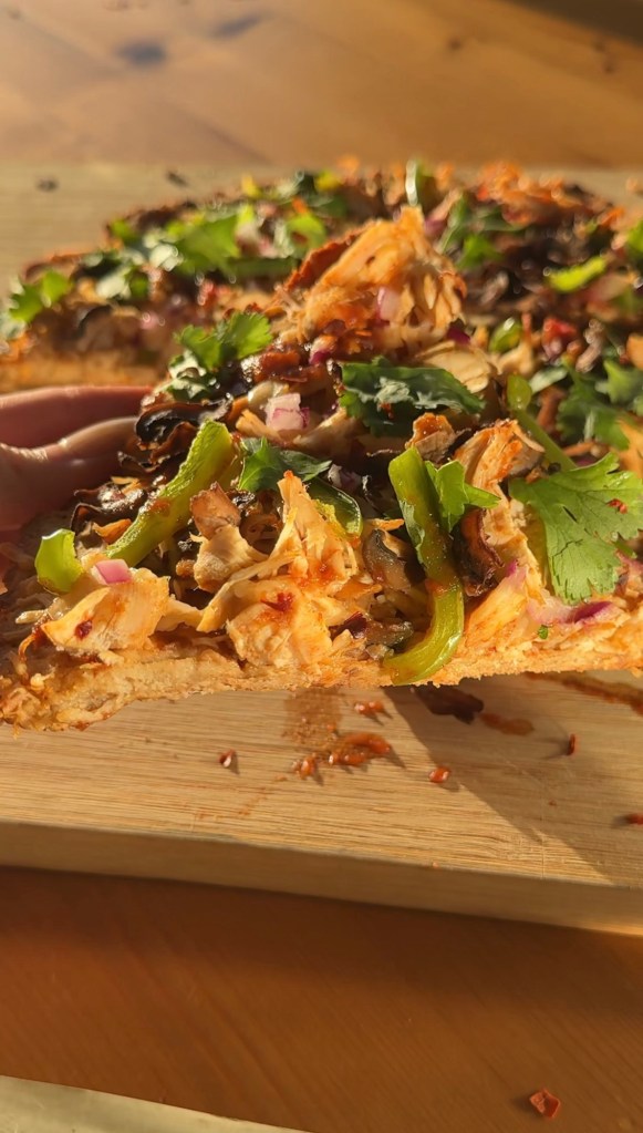 Remove from the oven, garnish with fresh cilantro and a drizzle of bbq sauce if desired, let it cool slightly before slicing.